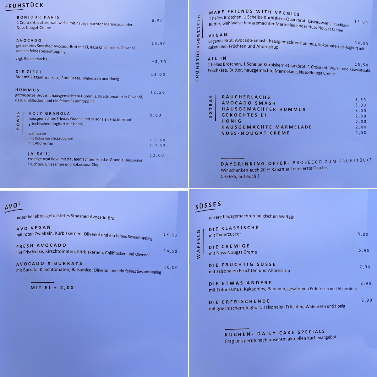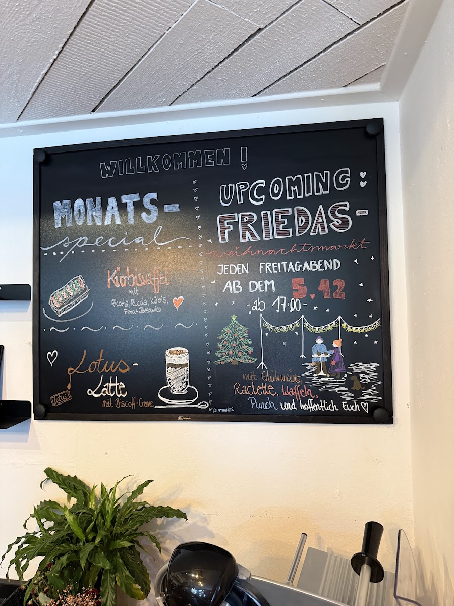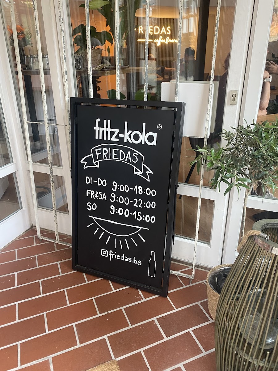 The menu at FRIEDAS Braunschweig offers a variety of options suitable for breakfast, brunch, and casual light meals. It features a selection of coffee-based drinks including Latte Macchiato, Chai Latte, and Milchkaffee with oat milk, catering to different preferences. Non-alcoholic beverages such as homemade lemonade and still water are also available, alongside alcoholic choices like the Lillet Wildberry.
