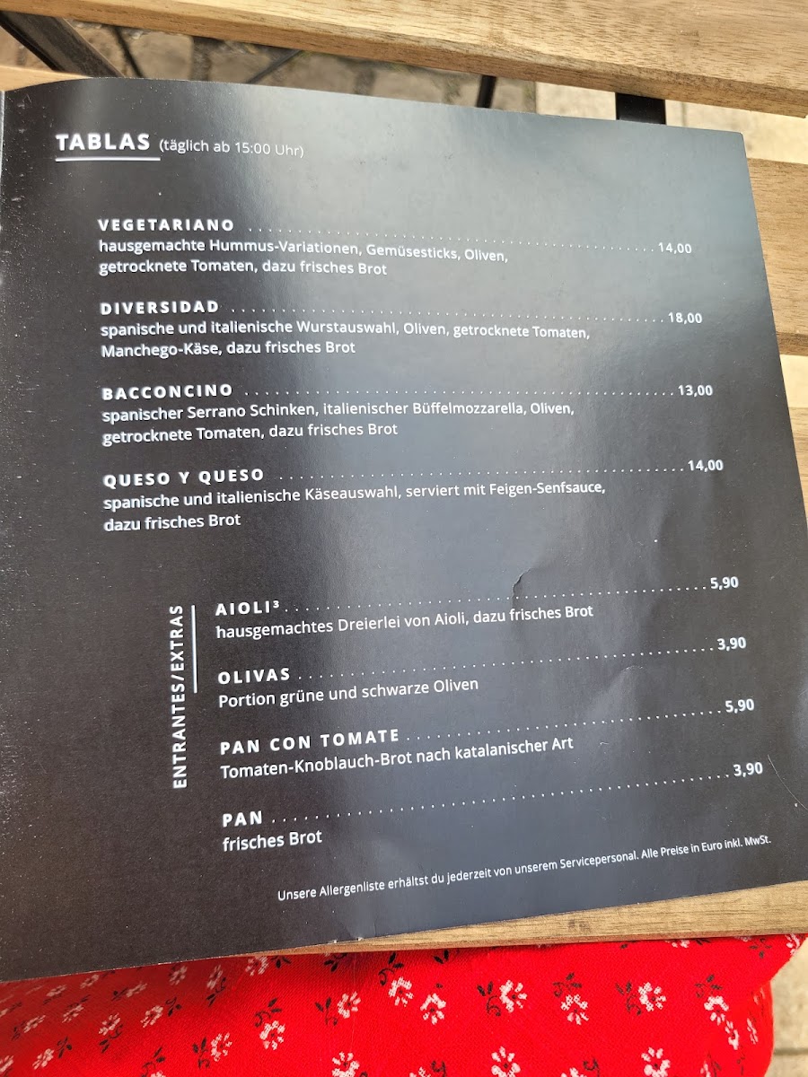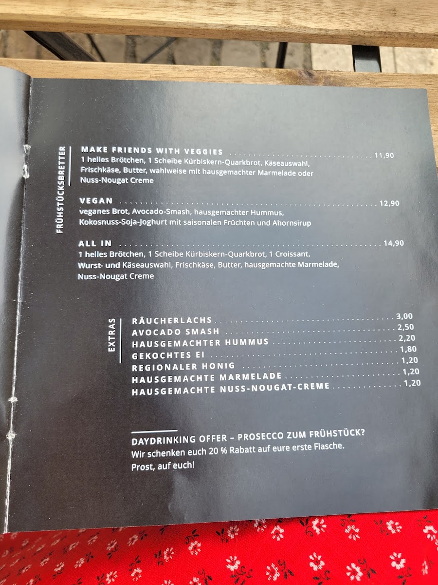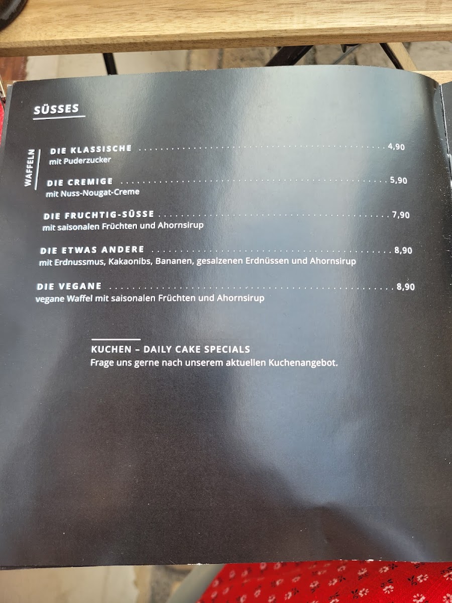 For dessert or sweet treats, the menu features items such as vegan Maulwurfkuchen, Schokokirschkuchen, and a classic dish with powdered sugar, highlighting a range of both traditional and plant-based options.